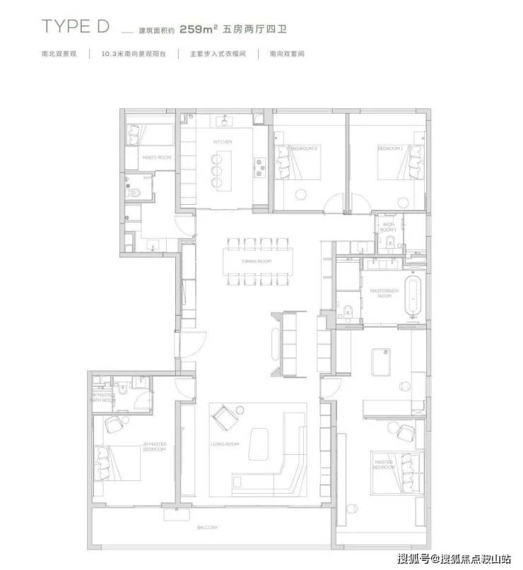 户型方面,自带南向景观阳台。宽度约10.3米,可以拿来做花园、茶室、成为业主的自由天地。