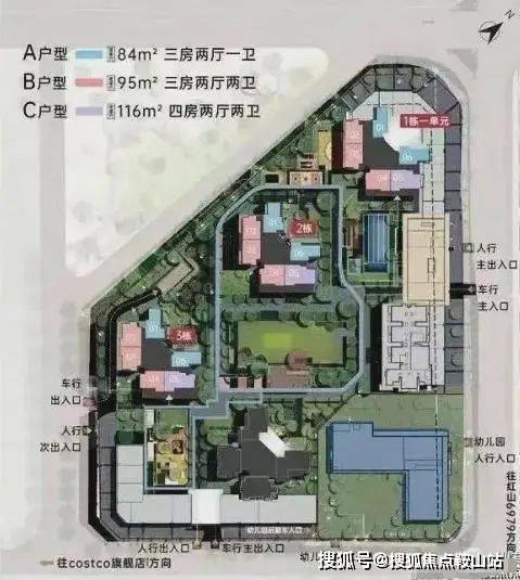 项目由1-5栋建筑主体组成,其中商品房位于1栋一单元、2栋和3栋,自持租赁房位于1栋二单元,安居房位于4栋,5栋为12班幼儿园。共规划1692户,其中住宅产品又分为三种类型产品:商品房共708户;全年自持租赁住房644户,安居房340户。可售商品房位于1栋1单元、2栋、3栋,共有三个面积段,分别为84㎡、95㎡、116㎡,带装修交付