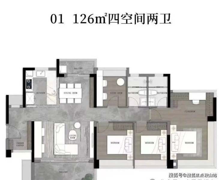 建面126平四房两卫,可以打通阳台,尺度感非常好,四个卧室各有亮点,主卧南北对流,加上270度飘窗,实现三面采光,三个次卧也都不小。