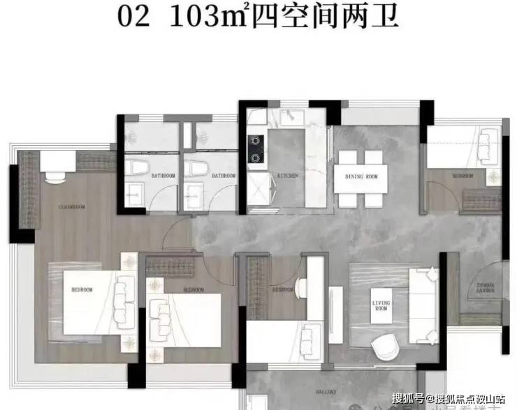 建面103平四房两卫,LDBK一体化设计,书房并入客厅,次卧还能做到床不靠窗,还有良好的动线空间,另一间北向次卧可用作二套房,主卧约280度飘窗,南北对流。
