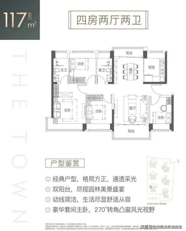 117㎡的4房2厅2卫,设计的是竖厅南北通透格局,独门独户,客厅3.9米开间,动静分区,主卧超大套间270°超广角视野,4个卧室都不用睡飘窗,U型厨房,卫生间干湿分离,得房率:77.41%(不含赠送),双阳台设计,大阳台主朝西南向,客厅阳台看乐城公园山景,餐厅阳台看小区花园。
