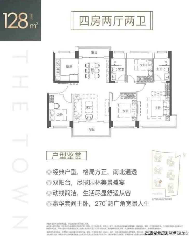 128㎡的4房2厅2卫,设计的是竖厅南北通透格局,独门独户,客厅4.2米开间,动静分区,4个卧室分别做到了3.7米/3.1米/3米/2.7米的宽度,主卧大套间,270°超广角视野,L型厨房,卫生间干湿分离,得房率:77.41%(不含赠送),双阳台设计,大阳台主朝东南向,客厅阳台看小区园林,餐厅阳台看乐城公园山景。