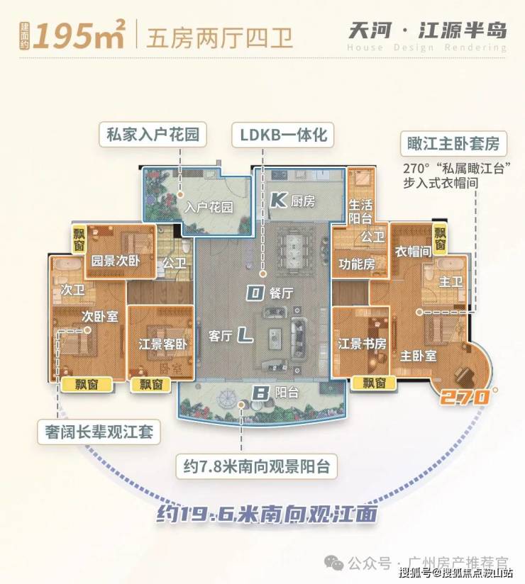 • 五开间南向采光,270°景观阳台