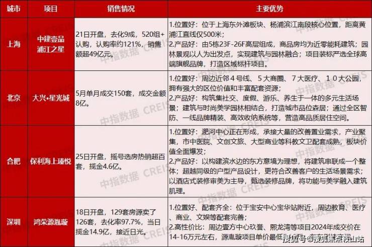 5月17日,全国切实做好保交房工作视频会议召开,监管部门接连落地多项举措,包括降低首付比例下限、取消首套和二套房贷利率下限等。“一揽子”政策落地对市场情绪带动明显,多个城市新房访盘量、二手房带看量出现回升。通过比较5月单月部分热点城市热销项目,主要带动销售的优势特点为好位置、好产品、性价比高。