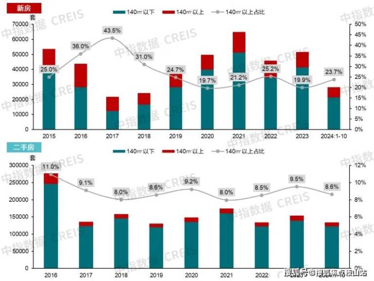 从成交结构来看,新房方面,多年来140m²以上户型占新房成交规模的20%以上,2024年1-10月,140m²以上户型成交占比为23.7%,较2023年提升3.8个百分点;二手房方面,140m²以上户型占比常年低于10%,2024年1-10月占比仅为8.6%。