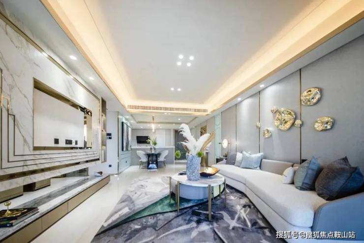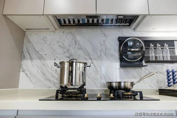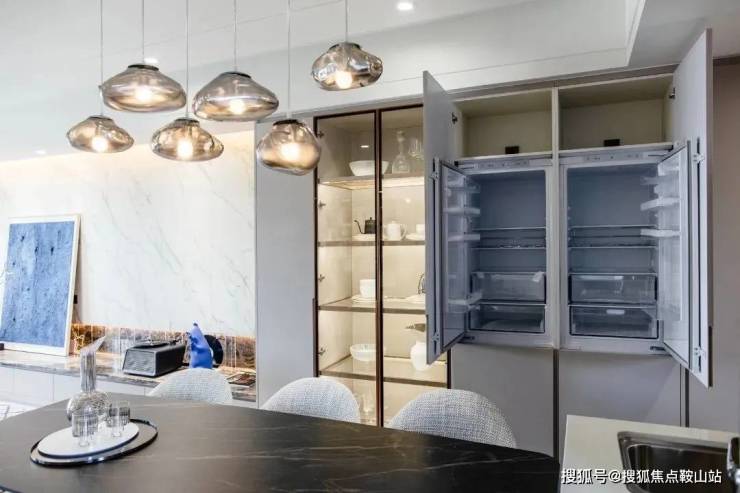 平滑细腻的视觉感受,与客厅的空间设计、材质相统一。为了使厨房空间更具观赏性,设计师将烟机、冰箱、洗碗机隐藏,厨房整体线条更加流畅。