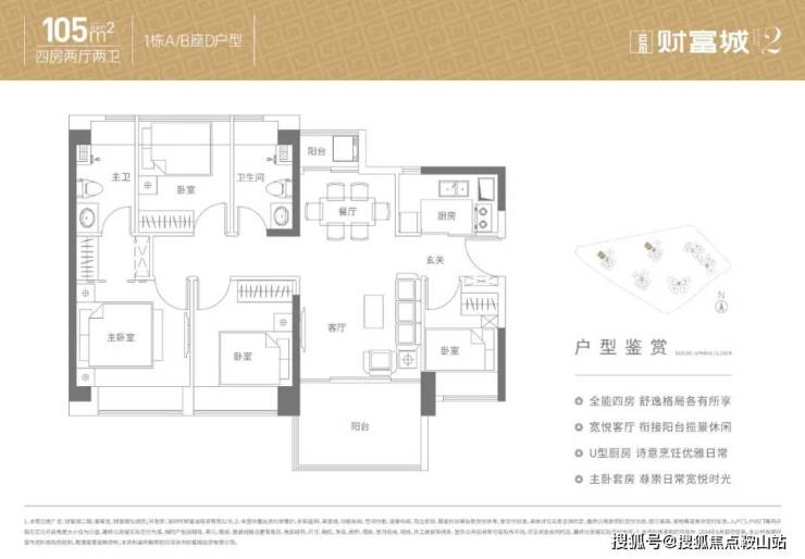 105㎡的4房2厅2卫,设计的是竖厅南北通透格局,客厅3.5米开间,全屋飘窗双阳台设计,4个卧室分别是3.25/2.85/2.6/2.1米的宽度,U型厨房,得房率:86.47%(包含赠送),阳台主朝西南向。