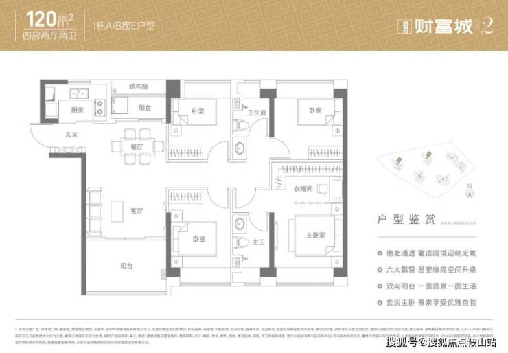120㎡的4房2厅2卫,设计的是竖厅南北通透格局,双阳台设计,客厅3.7米开间,4个卧室分别是3.2/3.2/2.75/2.75米的宽度,U型厨房,得房率:88.36%(包含赠送),阳台主朝东南、西北、东北向。
