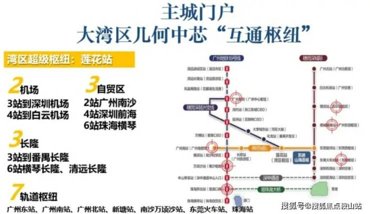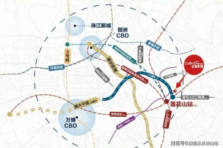 此外,距离项目2公里左右还有一个城市级的交通枢纽——莲花站,通过8号线3站可抵达琶洲;通过佛莞城轨,3站直达长隆,4站可达广州南站。