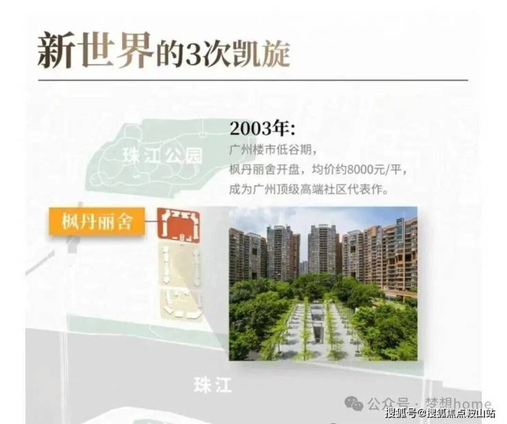 同年,凯旋新世界一期枫丹丽舍开盘,以约8000元/平的均价,成为广州顶级高端社区的代表作。
