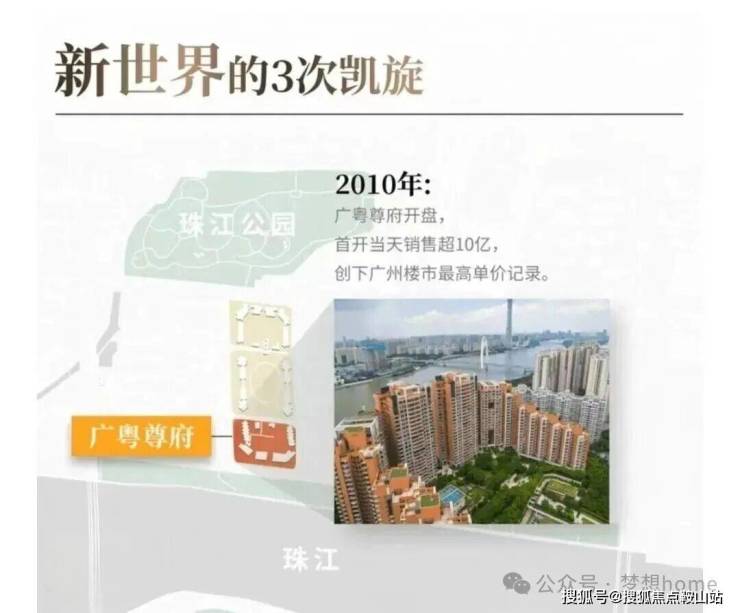 2010年,凯旋新世界广粤尊府首开,当天销售超10亿,一举创下广州楼市的最高单价记录。也正是这一年,广州楼价达到历史巅峰,涨幅为38%。
