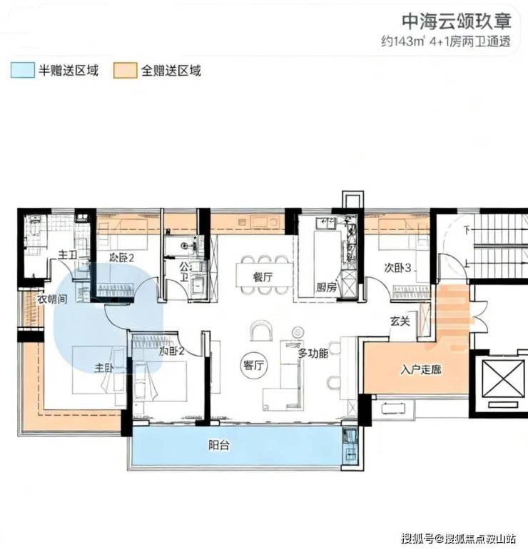 143㎡的4房2厅2卫,设计的是横厅南北通透格局,进门独立入户走廊全赠送,客餐厅分离化设计,横厅大客厅+功能间,五开间朝南,主卧270°无柱转角飘窗+1个次卧朝南,2个次卧朝北向,U型厨房,卫生间干湿分离,得房率约:100%(包含赠送),西南或正南朝向