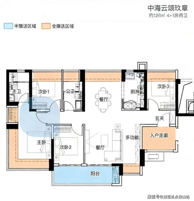 128㎡的4房2厅2卫,设计的是横厅南北通透格局,进门独立入户走廊全赠送,客餐厅分离化设计,横厅大客厅+功能间,五开间朝南,主卧270°无柱转角飘窗+1个次卧朝南,2个次卧朝北向,U型厨房,卫生间干湿分离,得房率约:100%(包含赠送),西南或东南朝向。