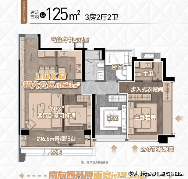 建面约125平方米:新规4房户型,全明4开间朝南,大面宽舒居约12.8米,IMAX大方厅,LDK一体化设计。