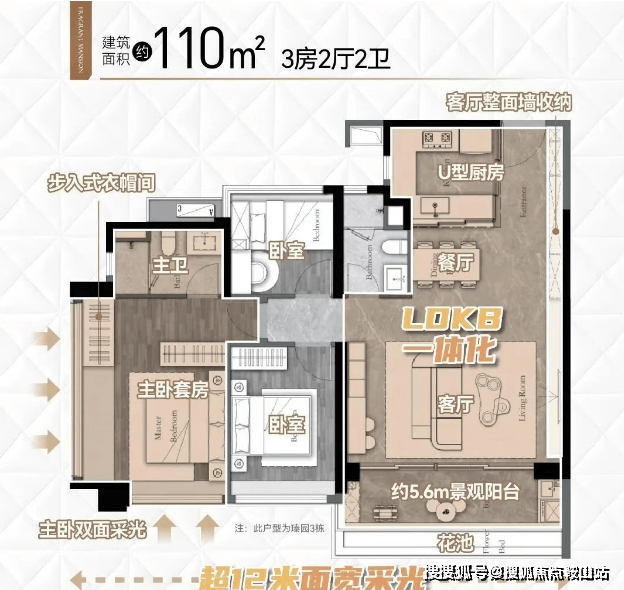 建面约111平方米:新规3房户型,全明3开间朝南,客厅宽敞约5.6米,LDK一体化设计,动静分区可变四房。