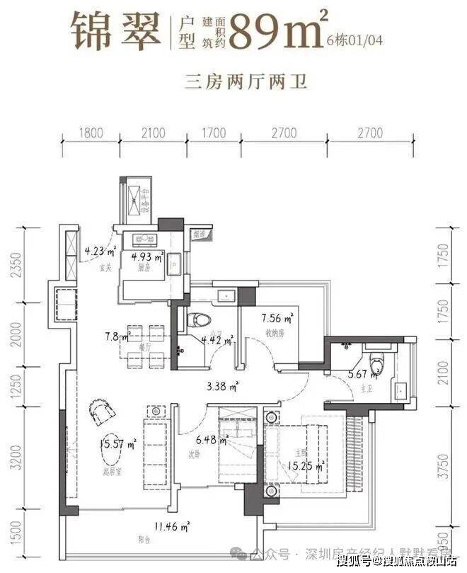 89㎡的3房2厅2卫,6栋01/04户型,设计的是经典竖厅格局,客厅3.5米开间,LDKB一体化,S墙设计预留冰箱卡槽位,三开间朝南,动静分区,主卧+次卧270°无柱转角飘窗,分别做到了主卧15.25㎡/次卧7.56㎡/次卧6.48㎡(包含墙体飘窗),U型厨房烟道外置,卫生间干湿分离,得房率约97.47%(包含赠送),客厅连接次卧出大阳台约11.46平,西南或东南朝向。