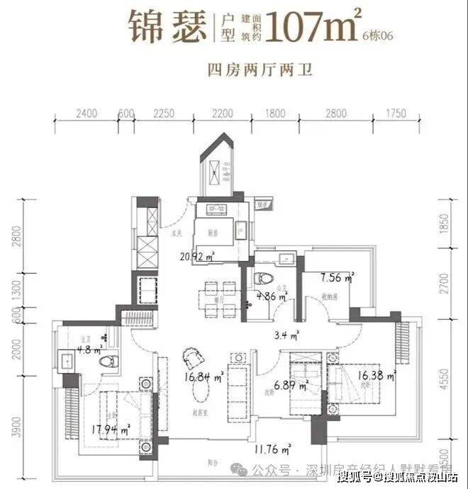 107㎡的4房2厅2卫,设计的是竖厅双龙抱珠格局,客厅3.7米开间,LDKB一体化设计,预留冰箱卡槽位,四开间朝南,主卧+2个次卧270°无柱转角飘窗,分别做到了主卧17.94㎡/次卧16.38㎡/次卧7.56㎡/次卧6.89㎡(包含墙体飘窗),U型厨房烟道外置,卫生间干湿分离,得房率约104.06%(包含赠送),客厅连接次卧出超大阳台约11.76平,东北朝向。