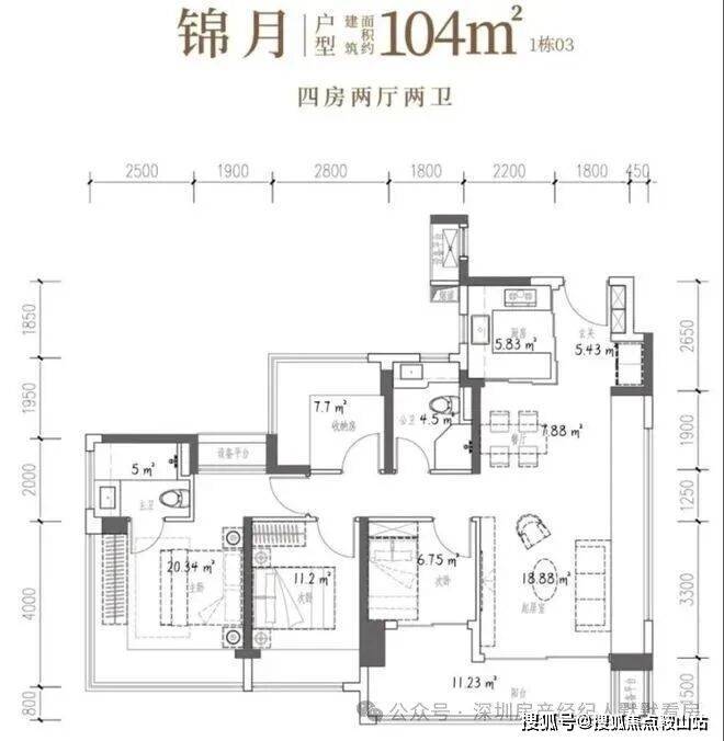 104㎡的4房2厅2卫,设计的是竖厅格局,客厅4.15米开间,LDKB一体化设计,预留冰箱卡槽位,四开间朝南,动静分区,主卧270°无柱转角飘窗还带1个设备平台约1.52平,分别做到了主卧20.34㎡/次卧11.2㎡/次卧7.7㎡/次卧6.75㎡(包含墙体飘窗),U型厨房烟道外置,卫生间干湿分离,得房率约100.71%(包含赠送),客厅连接次卧出大阳台约11.23平,西南朝向。