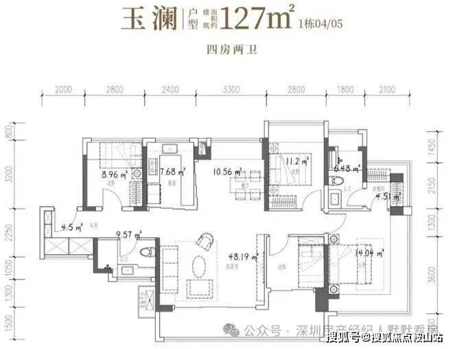 127㎡的4房2厅2卫,设计的是竖厅南北通透格局,进门独立玄关,客厅5.1米开间,客餐厅分离化设计,主卧270°无柱转角飘窗+衣帽间,分别做到了主卧18.55㎡/次卧11.2㎡/次卧8.96㎡/次卧7.84㎡(包含墙体飘窗),U型厨房烟道外置,卫生间干湿分离,得房率约98.97%(包含赠送),客厅连接次卧出超大阳台约14.09平,西南或东南朝向。