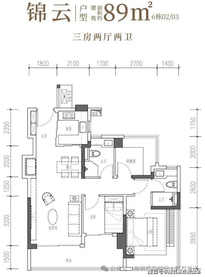 89㎡的3房2厅2卫,6栋02/03户型,设计的是经典竖厅格局,客厅3.5米开间,LDKB一体化,S墙设计预留冰箱卡槽位,三开间朝南,动静分区,主卧+次卧270°无柱转角飘窗,分别做到了主卧15.25㎡/次卧7.56㎡/次卧6.48㎡(包含墙体飘窗),U型厨房烟道外置,卫生间干湿分离,得房率约97.47%(包含赠送),客厅连接次卧出大阳台约11.46平,西南或东南朝向。主要区别在于次卧跟主卫空间。
