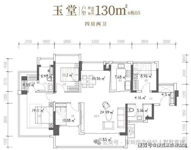 130㎡的4房2厅2卫,设计的是竖厅南北通透格局,进门独立玄关,客厅5.1米开间,客餐厅分离化设计,主卧270°无柱转角飘窗+衣帽间,分别做到了主卧23.66㎡/次卧11.2㎡/次卧8.96㎡/次卧7.84㎡(包含墙体飘窗),U型厨房烟道外置,卫生间干湿分离,得房率约101.95%(包含赠送),客厅连接次卧出超大阳台约14.09平,东北朝向。