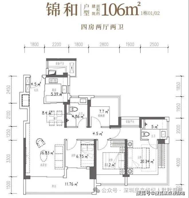 106㎡的4房2厅2卫,设计的是竖厅格局,客厅3.7米开间,LDKB一体化,S墙设计预留冰箱卡槽位,四开间朝南,动静分区,主卧270°无柱转角飘窗还带1个设备平台约1.52平,分别做到了主卧20.34㎡/次卧11.2㎡/次卧7.7㎡/次卧6.75㎡(包含墙体飘窗),U型厨房烟道外置,卫生间干湿分离,得房率约101.16%(包含赠送),客厅连接次卧出大阳台11.76平,东南朝向。