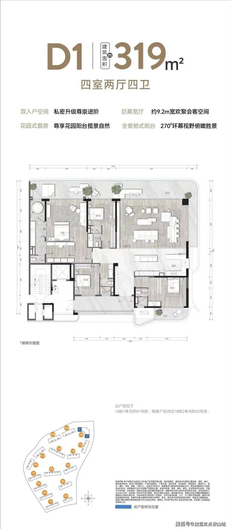 319㎡户型四室两厅四卫格局,为高端家庭拓展了广阔的生活尺度。