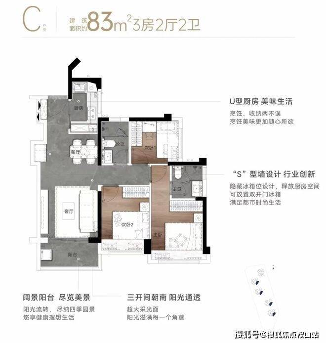 83㎡的3房2厅2卫,设计的是经典竖厅格局,客厅3.3米开间,入户预留S型冰箱位,可以放双开门冰箱,三开间朝南,U型厨房,得房率80.4%(不加飘窗),客厅阳台全部东南朝向。