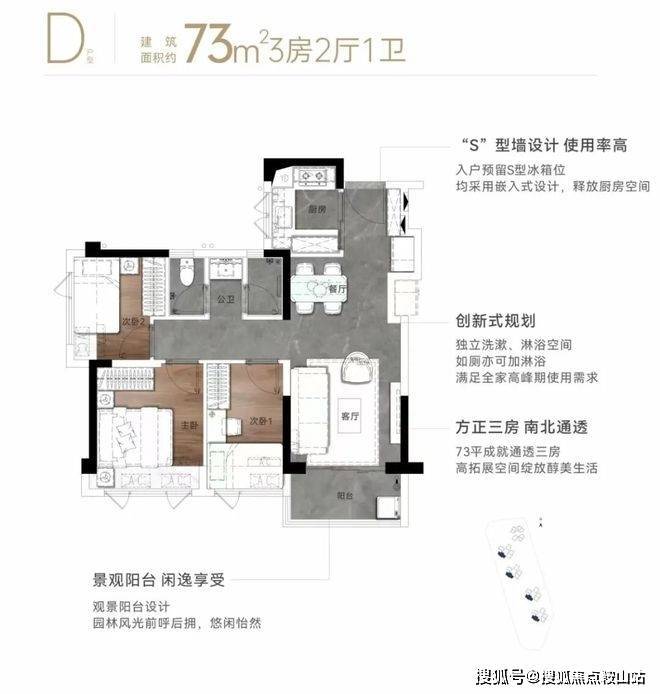 73㎡的3房2厅1.5卫,设计的是竖厅格局,客厅3.1米开间,入户预留S型冰箱位,三开间朝南,U型厨房,创新式卫生间设计,独立洗漱,沐浴空间,如厕也可加沐浴,得房率80.3%(不加飘窗),都是西南朝向。