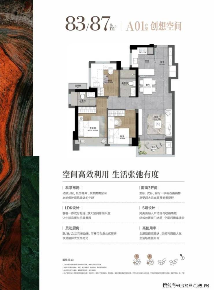 83-87㎡的3房2厅2卫,经典竖厅格局,客厅实测3.14米开间,LDKB一体化,S墙设计预留冰箱卡槽位,三开间朝南,U型灵动式厨房,卫生间干湿分离,得房率约76-81%(不含赠送),西南朝向。