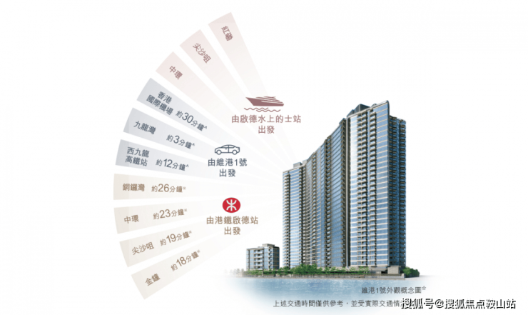 由港铁启德站出发,轻松连接屯马线及观塘线,当中贯穿新界九龙,到购物热区尖东站也只需13分钟,沿线多个转车站可轻松连接各个关口。未来启德跑道公园码头更会设有水上的士,开通后可轻松易达红磡、尖沙咀、中环等主要商业据点。