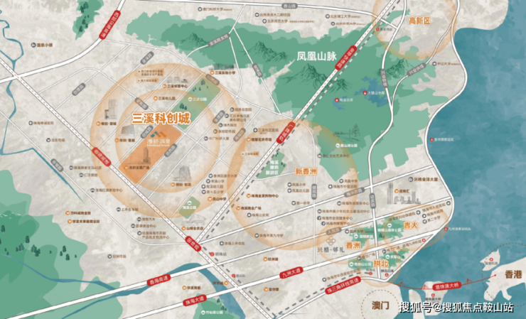 这里南邻中山坦洲,西接中山三乡,交通路网四通八达,香海高速、香洲大道、金琴快线及广珠城际等交通要道在此交汇,轻松实现 15 分钟通达全城,更能快速融入粤港澳大湾区 1 小时生活圈。