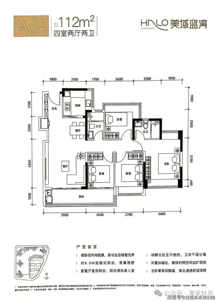 A2户型-112㎡的4房2厅2卫,设计的是竖厅格局,客厅连接次卧出阳台(有6.5米长),四开间朝南,S墙设计预留冰箱位,主卧双飘窗南北对流,U型厨房,得房率:80.12%(不含赠送),有西南或东北朝向。