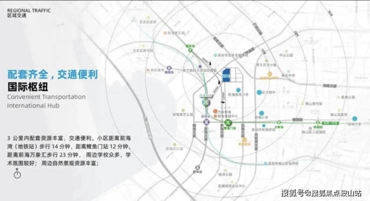 项目西侧隔双界河是宝中,从项目出发乘坐1-2站地铁或驾车10分钟左右可达宝安图书馆、少年宫、湾区之眼、滨海艺术中心和宝体。
