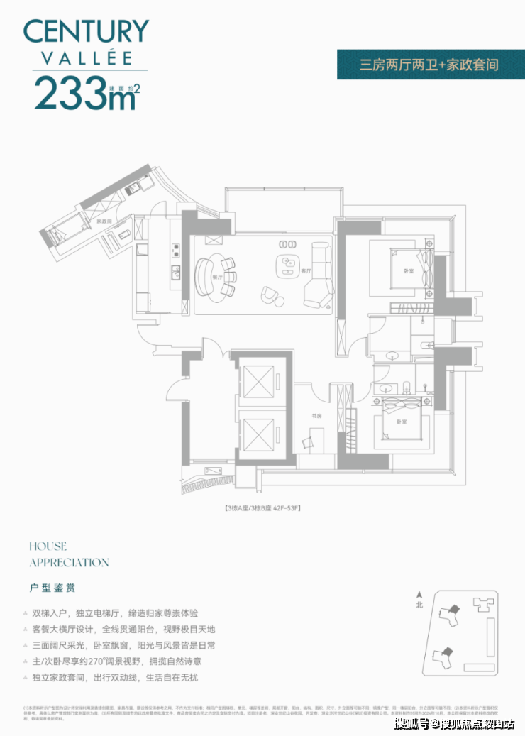 前两次都是公寓,现在住宅首发!还是定位相当高端的纯大平层而且还是无敌景观视野,8梯3户,233㎡/280㎡配备两个独立电梯,386㎡双梯设计,实在任性!