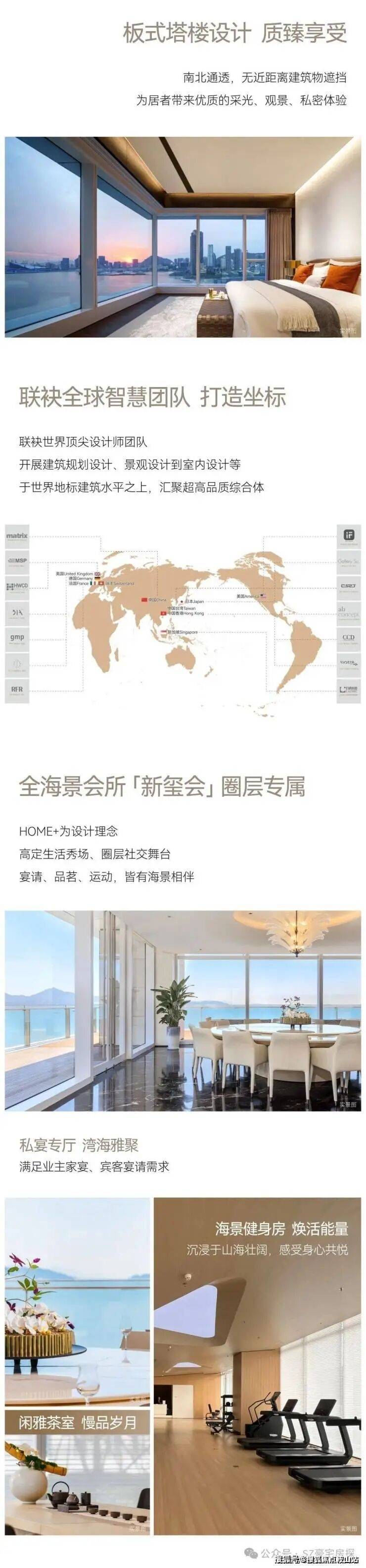 内部配套:配备高端私密会所、约 766 平方米的深圳首个悬空无边际海景泳池、首层城市花园、健身房、儿童游乐区以及 1800 平方米的海洋博物馆等设施。
