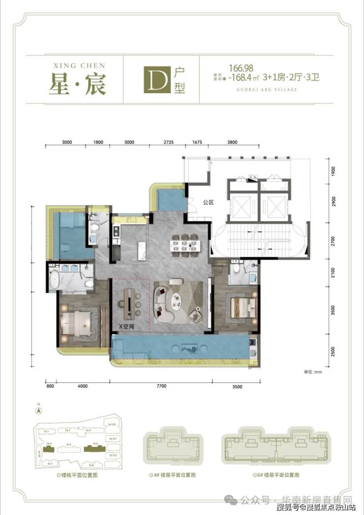 D户型: 建面约166.98-168.4㎡ 3+1房2厅3卫