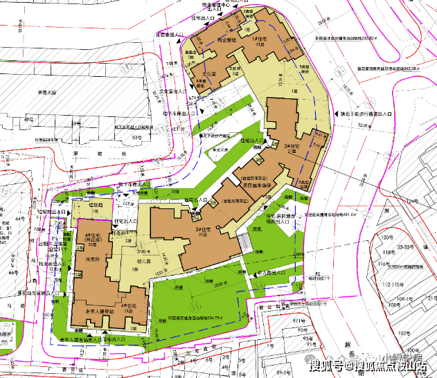 广州城投东园公馆占地面积仅为8470㎡,规划了4栋21-23层住宅,整体容积率高达5.8;其中,南端的4#住宅为回迁房,其余3栋则为商品房,均为塔楼设计。