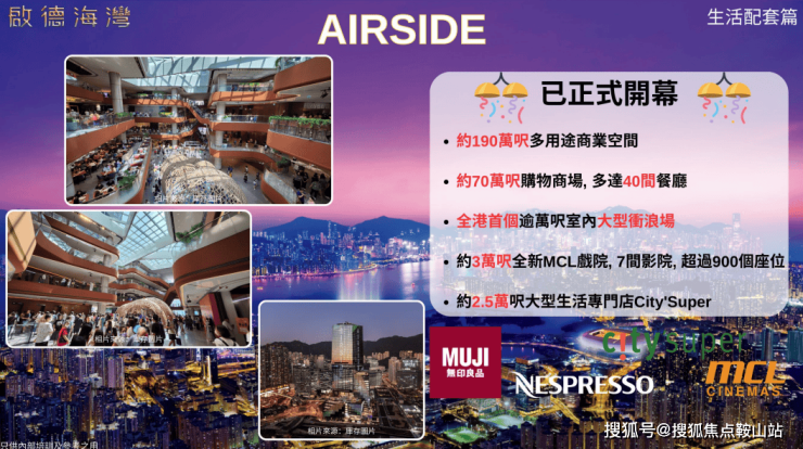 作为港府未来的新盘供应重地,启德跑道区由九大发展商联手打造,坐拥千亿投资配套。启德区有商场食肆,大型商场AIRSIDE也已开幕,设有过万呎美食广场,还有戏院及多个国际品牌进驻,基本上可以满足到区内住客需要。