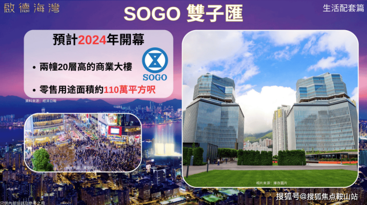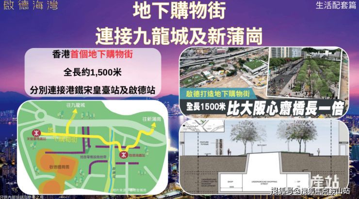 而未来长达1,500米的地下购物街、水上活动中心、启德体育园、SOGO双子汇、都会公园亦将相继落成。这里与喧嚣的商业区不一样,是多个休闲空间的落成,户外空间大也是它的卖点之一。