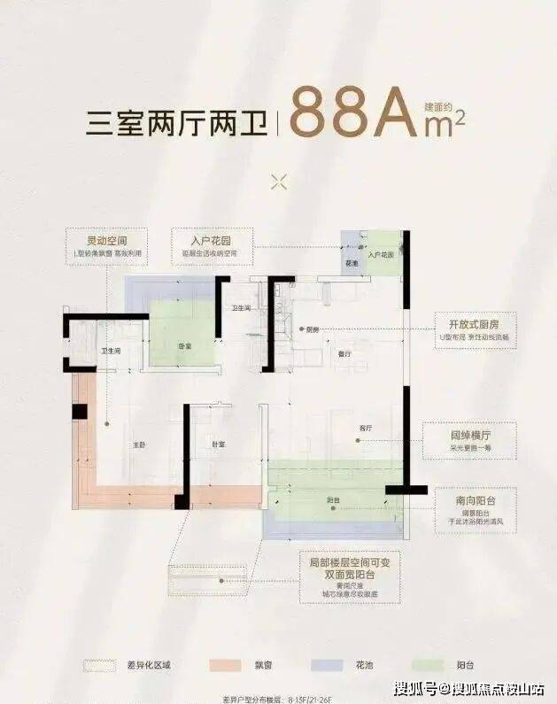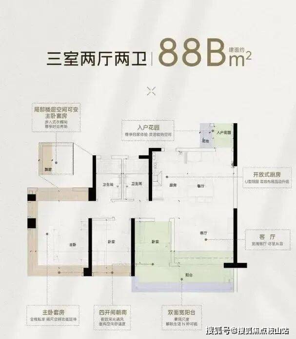 约88平方米B户型:南向三房两厅两卫,主卧270°飘窗可做创意功能区,中西厨分离,7.3米通铺阳台。