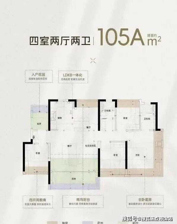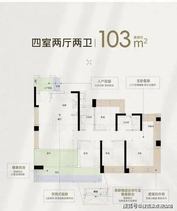 约103平方米户型:四房两厅两卫,独立入户花园,约7米通铺阳台,270°全景采光大主卧。