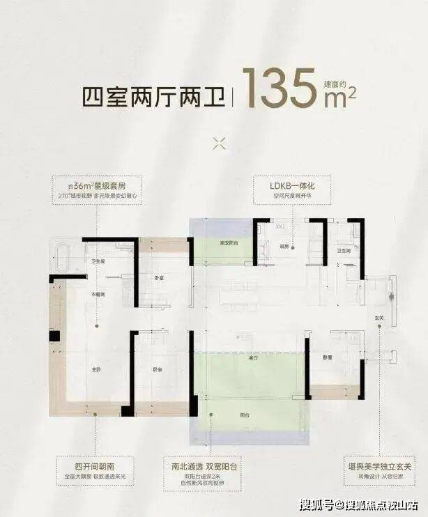 约135平方米户型:四房两厅两卫,南北通透双阳台,约5.25米大宽厅和约5.45米大阳台,宽敞舒适。