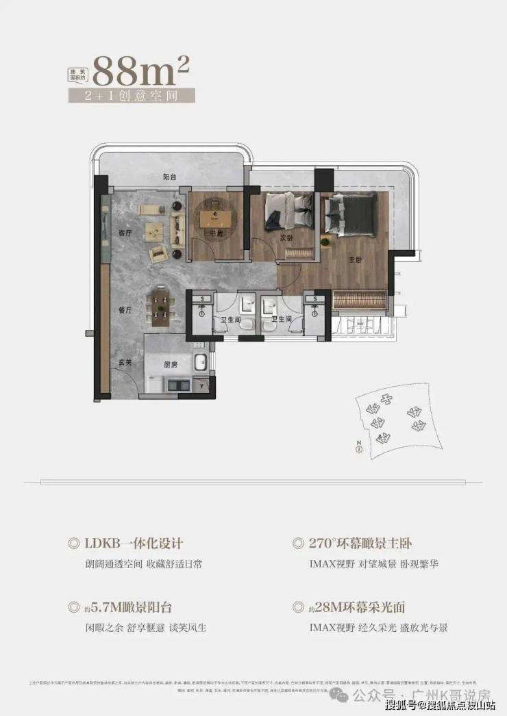 88㎡户型,约5.7M巨幕阳台 | 270°环幕瞰景主卧|LDKB一体化设计