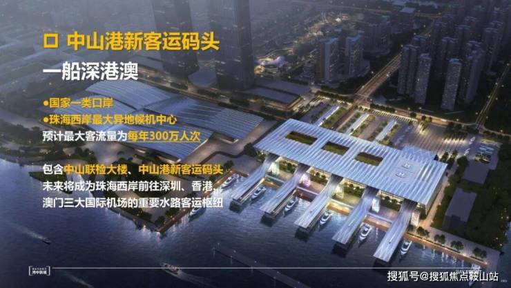 中山港新客运码头,为国家一级口岸,预计最大客流量可达300万人次/年,连接黄金内湾100公里,也将带来不可估量的客流红利!