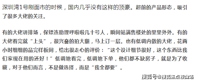 深圳湾1号让精英们趋之若鹜的原因,是“懂得赚有钱人的钱”。就像上面那位“中国巴菲特”形容的,财务自由了,遇到触动灵魂的东西,绝不能错过,绝不能留遗憾。