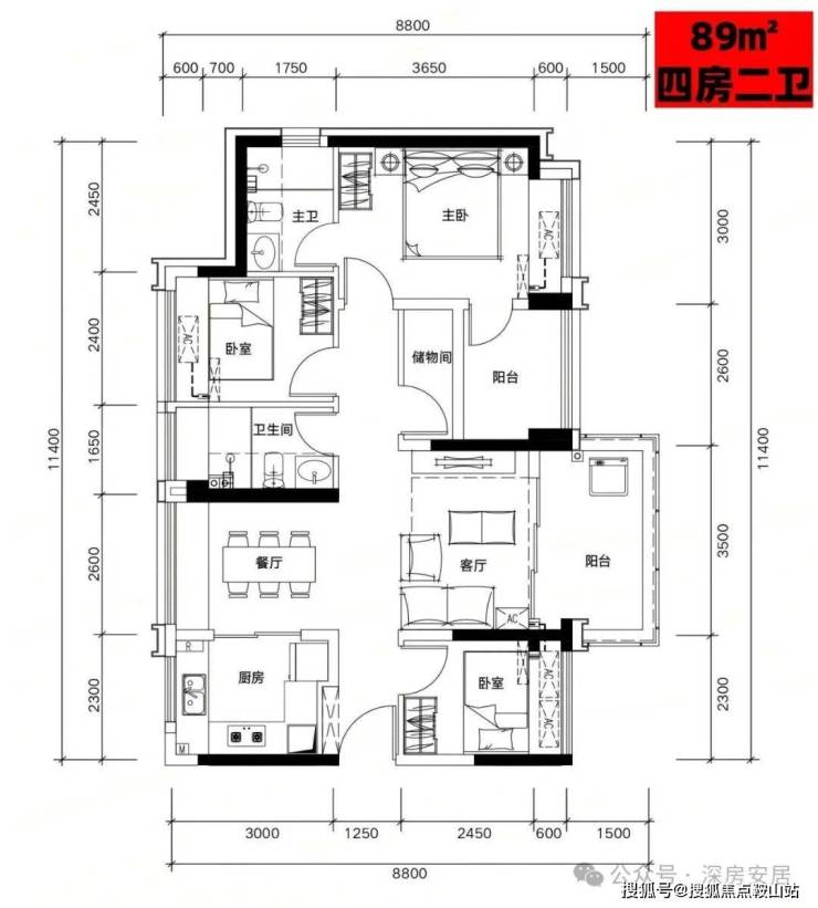 B01户型:89㎡四房二厅二卫