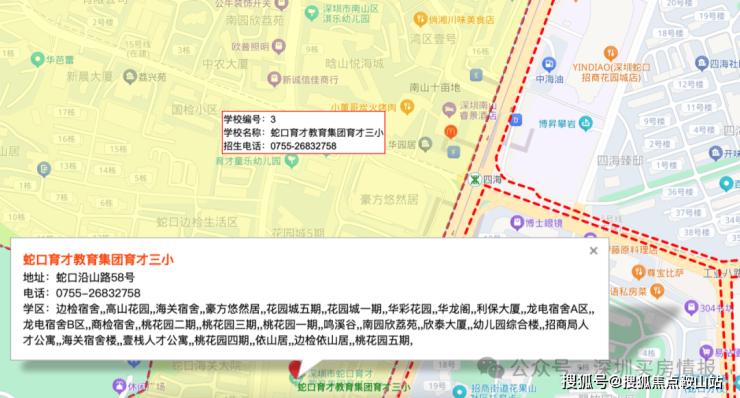 南园晗山悦海城,属深圳市南山区的招商街道办管辖,位于深圳市12号地铁线四海站e出入口上盖;由深圳市华园房地产开发有限公司在2018年开建,2022年开始交房入伙,小区一共4栋楼,总占地面积约19300平方米,总户数约1951套,停车位约1700个,停车位很充裕,开进小区先到先得,物业服务中心为深圳市招商物业管理有限公司。