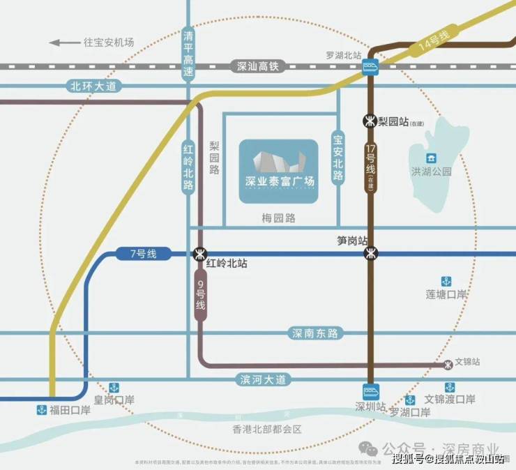 ④全维立体交通 纵横世界脉搏四轨纵横:项目经地下通道直达7/9号线双地铁站,毗邻14、17(在建)号线主轴汇聚:泥岗路、笋岗路、红岭北路、宝安北路、文锦北路等主干道环绕双高铁站:深圳站枢纽、罗湖北站枢纽(在建)在侧,开启非凡商务体验三大口岸:罗湖口岸、文锦渡口岸、莲塘口岸,快速联通深港双城