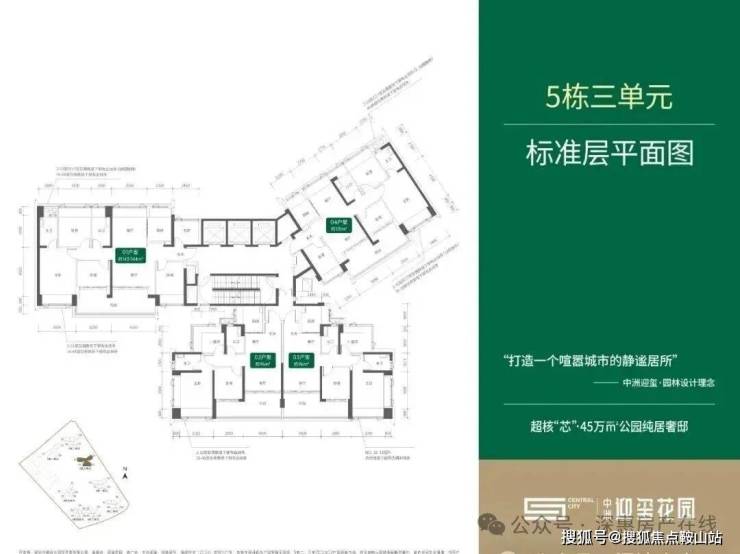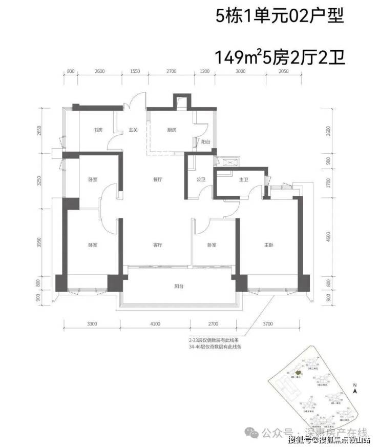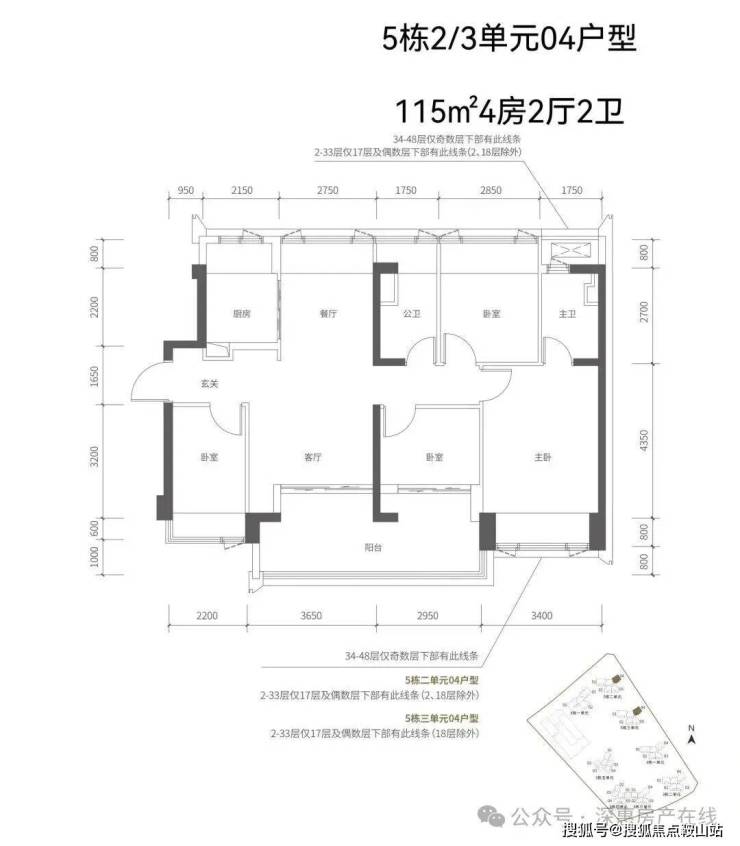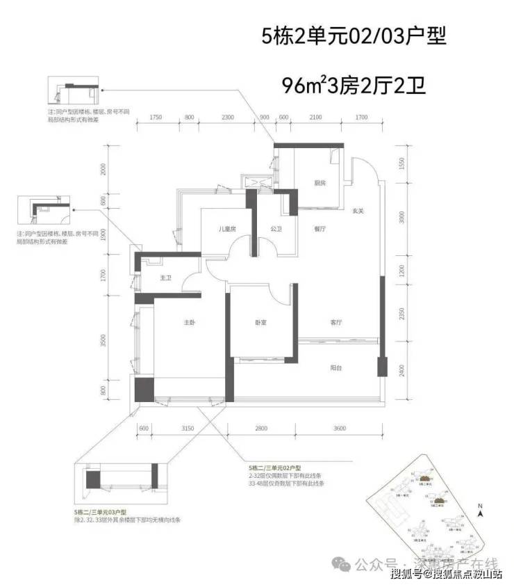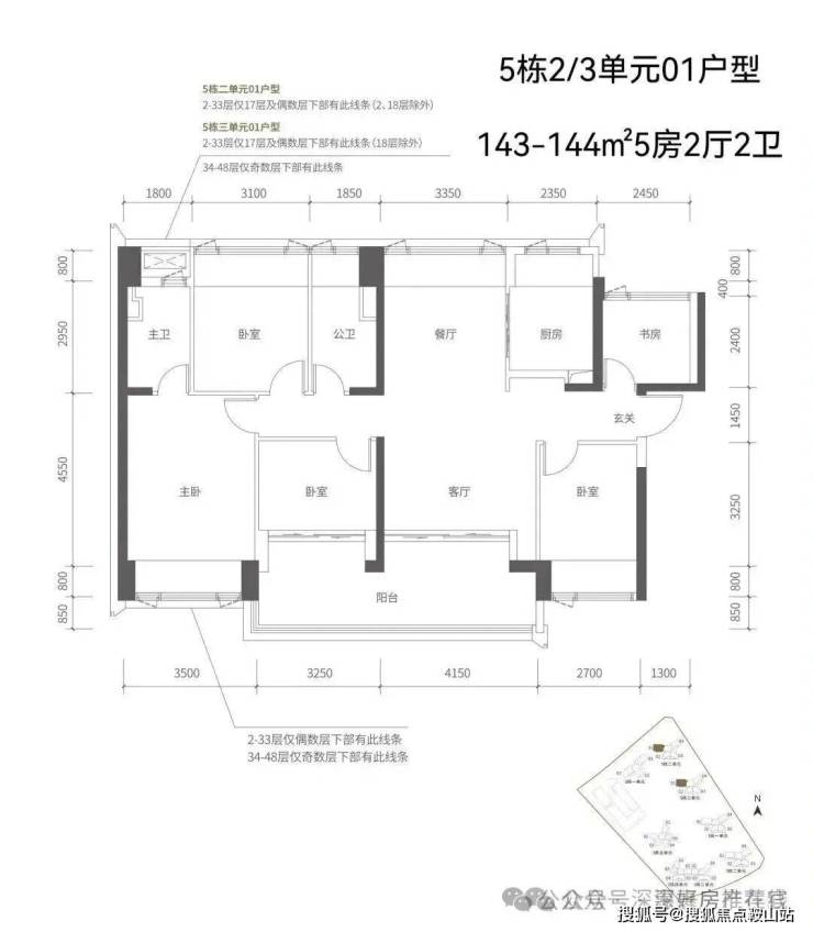 【五栋二、三单元-平面图】3梯4户,4条腿,01号房户型约144㎡的5房2厅2卫,02、03号房户型约96㎡的3房2厅2卫,04号房户型约115㎡的4房2厅2卫。
